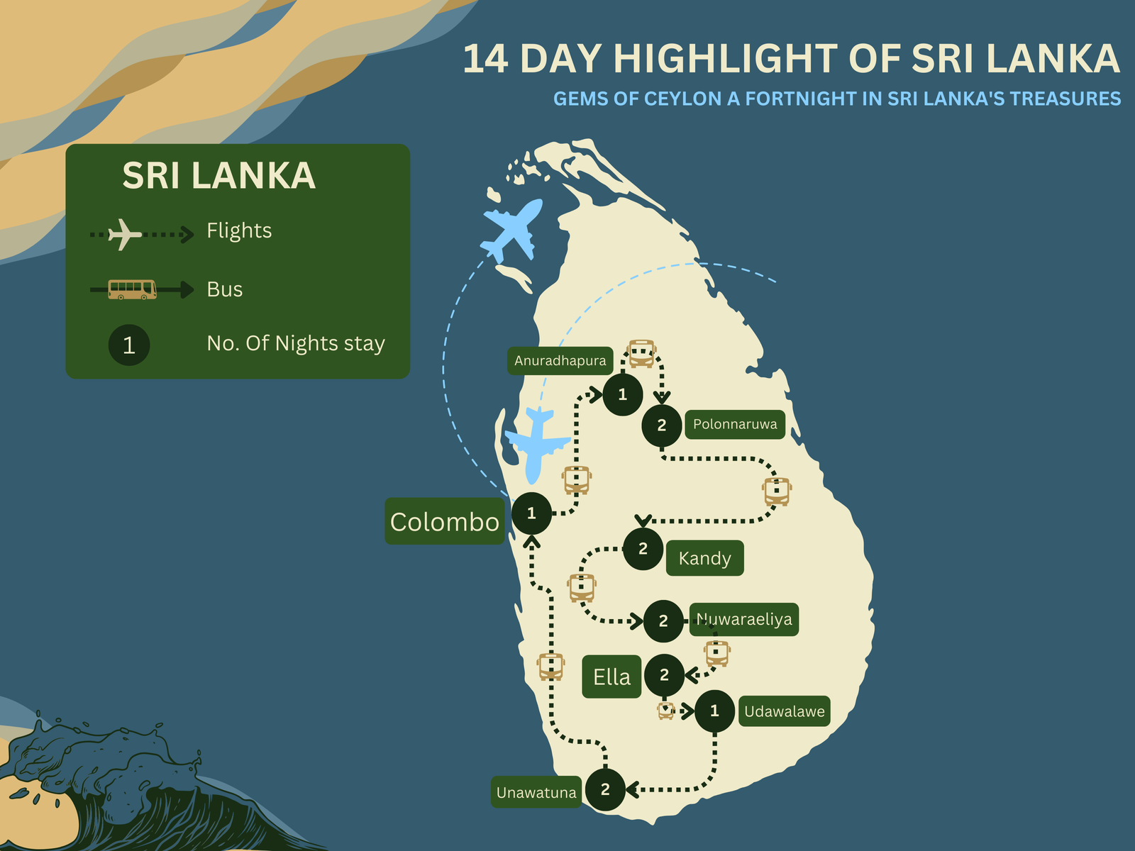 Day by Day Itinerary: (Colombo (1 night), Anuradhapura (1 night), Polonnaruwa (2 night), Kandy (2 night), Nuwara Eliya (2 night), Ella (2 night), Udawalawa (1 night), Unawatuna (2 night)
