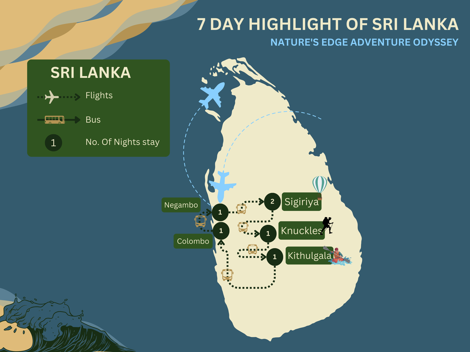 Day by Day Itinerary: (1 night), Sigiriya (2 night), Knuckels (1 night), Kithulgala (1 night), Colombo (1 night)